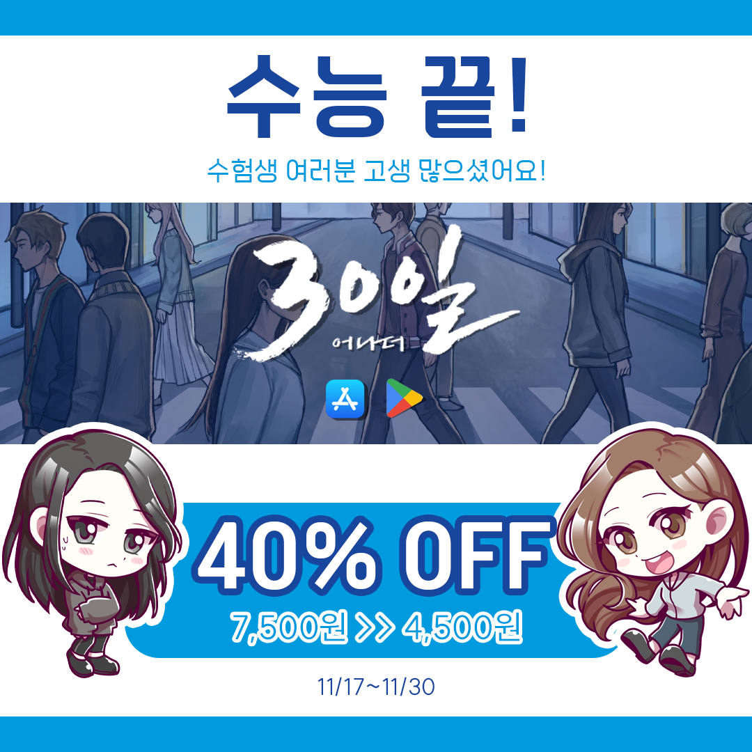 저희 더브릭스게임즈도 고생한 수험생 여러분을 응원하는 마음으로 「30일 어나더」(모바일) 할인 행사를 준비했습니다!